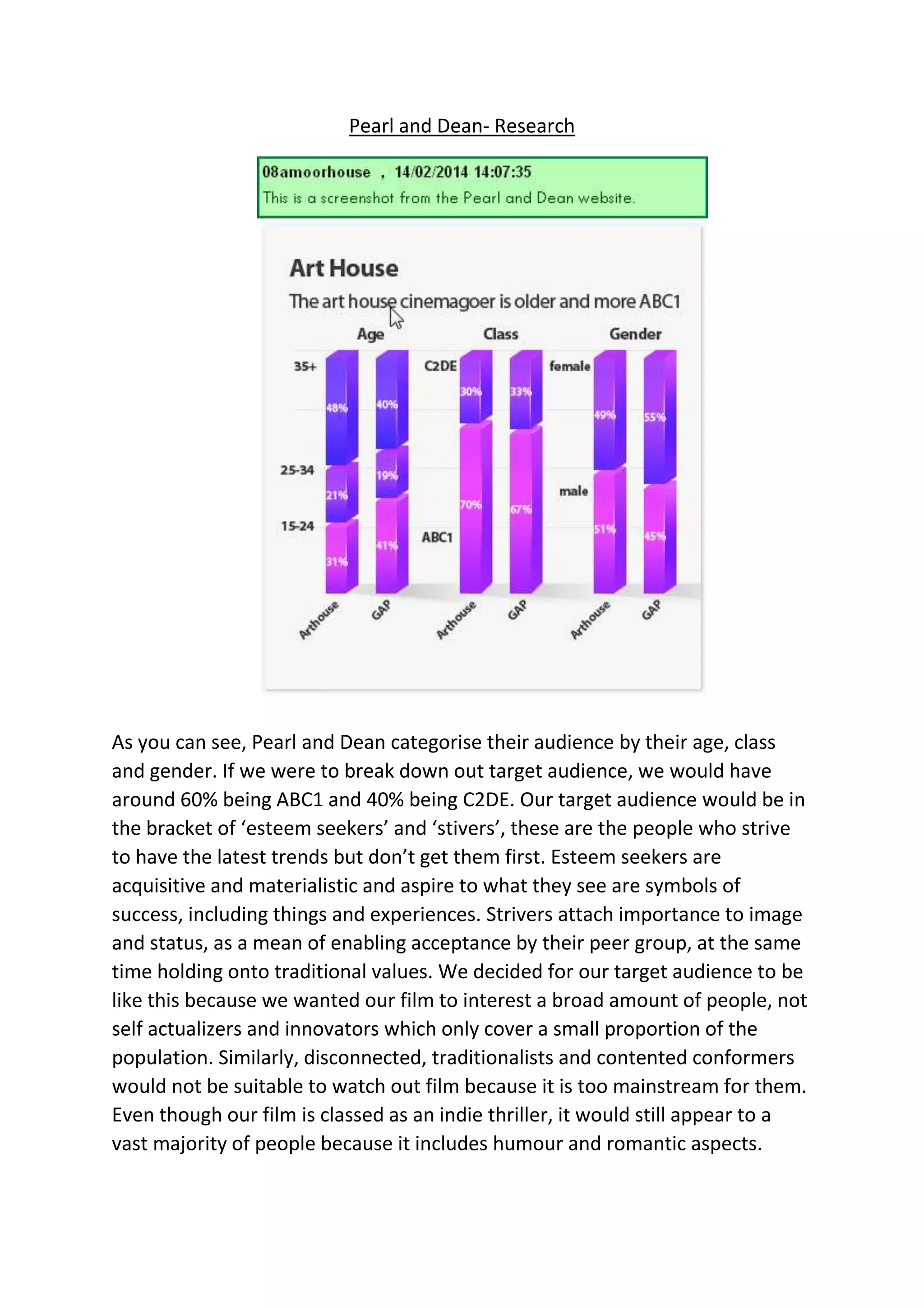Pearl and Dean categorizes their target audience as 60% ABC1 and 40% C2DE, falling into the "esteem seekers" and "stivers" segments. These groups strive for the latest trends but do not adopt them first. Esteem seekers are materialistic and value symbols of success. Strivers value image and status as a means of acceptance while maintaining traditional values. Pearl and Dean chose this target audience to interest a broad population, rather than smaller groups like innovators. Their indie thriller includes humor and romance to appeal to a vast majority while still being independent.
