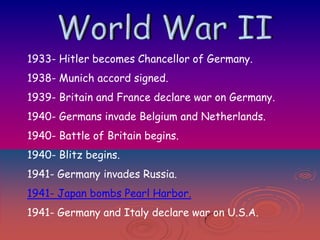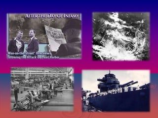 1) On December 7, 1941, Japanese forces launched a surprise attack on the U.S. naval base at Pearl Harbor in Hawaii. Over 2,400 Americans were killed and many ships and aircraft were destroyed in the attack.