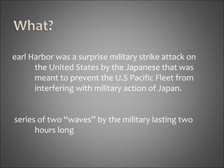 On December 7, 1941, the Japanese launched a surprise attack on the U.S. naval base at Pearl Harbor in Hawaii. The attack consisted of two waves of aircraft that inflicted heavy damage, sinking four U.S. battleships and damaging many other ships and aircraft. The attack killed over 2,400 Americans and drew the United States into World War II. The bombing of Pearl Harbor was planned by Japanese admirals as a preemptive strike to neutralize the U.S. Pacific fleet and enable Japan's military expansion across Asia and the Pacific.