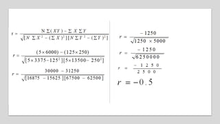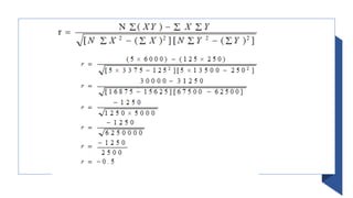 The document discusses Pearson's correlation coefficient, a statistical method developed by Francis Galton to assess the relationship between two variables. It covers definitions, types of correlation (positive, negative, and zero), methods of computation, and the significance and limitations of Pearson's method. The document also provides an example calculation and emphasizes the advantages and disadvantages of using Pearson's correlation coefficient.