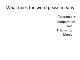 The document discusses values of pease through short phrases including tolerance, cooperation, love, friendship, and mercy. It presents these concepts as what the word pease means without further details or examples. The document advocates for these positive values in a very brief manner through just a list of terms.