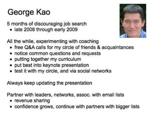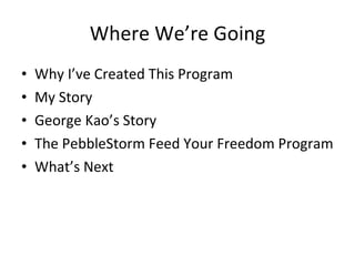 This document describes a program called "PebbleStorm Feed Your Freedom" that helps professionals start a consulting or coaching practice to generate $5,000-$10,000 per month while only requiring 1-3 days of work per week. The 3-month program includes tele-seminars, accountability teams, and support to help participants get their first two clients. It aims to help people design services that preserve their freedom and lifestyle. Common questions the creator has heard are addressed, and it is noted that further development is needed before launching the program.