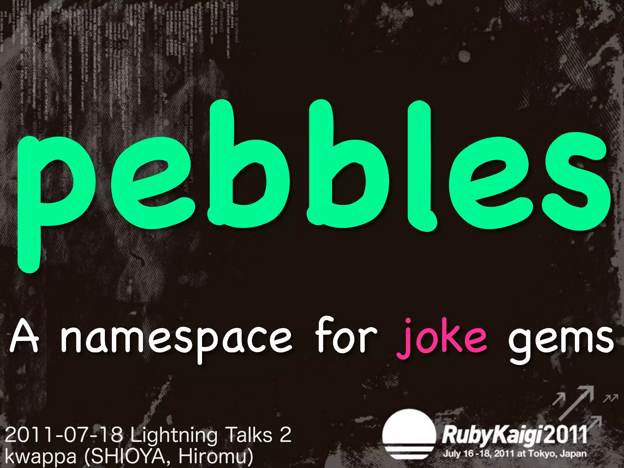 The document proposes the use of the namespace 'pebbles' for joke gems in Ruby programming, highlighting examples like the 'zenra' gem and 'fizzbuzz'. It emphasizes the importance of naming conventions for gems, suggesting the use of underscores for certain gems and dashes for extensions. The author concludes with an apology for previous mistakes and reaffirms the distinction between 'pebbles' and gems.