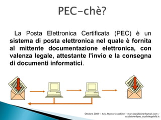 Il documento fornisce una panoramica dettagliata sulla posta elettronica certificata (PEC), evidenziando la sua valenza legale, le varie tipologie di ricevute e i requisiti normativi per l'utilizzo sia da parte dei privati che delle pubbliche amministrazioni. Vengono inoltre discusse le regolamentazioni specifiche riguardanti le comunicazioni nel contesto di processi civili e penali. Infine, si fa riferimento alle recenti modifiche normative e alle obbligazioni per i professionisti e le imprese riguardo alla dichiarazione dell'indirizzo PEC.