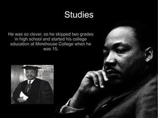 Martin Luther King Jr. skipped two grades in high school and started college at age 15, earning degrees from Morehouse College and Boston University. His father was a minister who inspired his career path. In 1953 he married Coretta Scott and had four children. He protested segregation and racism against black people. On April 4, 1968, at age 39, Martin Luther King Jr. was assassinated while standing on a hotel balcony in Memphis, Tennessee.