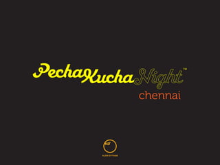 Pecha Kucha Night started in Tokyo in 2003 as a place for young designers to showcase their work. It involves presentations of 20 images shown for 20 seconds each, for a total time of 6 minutes and 40 seconds. It has since expanded to over 290 cities globally. Presenters span a wide range, from professionals to amateurs, students to acclaimed designers. The simple format levels the playing field and makes it about how the presenter uses the limited time. There is no formal Q&A, instead allowing discussions throughout the event. Volunteers are sought to help organize the first Pecha Kucha Night in Chennai through tasks like poster design, location setup, and music.