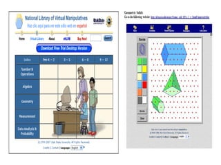 Virtual manipulatives are computer-based simulations of physical objects that allow students to explore mathematical concepts. They have several benefits over physical manipulatives, including visual representations of abstract ideas, scaffolding of student learning, and active engagement through student-created problems. Popular websites for virtual manipulatives include the National Library of Virtual Manipulatives and Illuminations. According to theories of cognitive development and constructivism, virtual manipulatives can support students' learning as they develop reasoning skills and actively construct understanding.