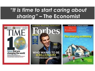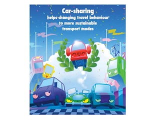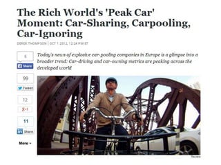 The document discusses the concept of local cohesion through technology and car-sharing initiatives, highlighting Zurich as a model with 342 cars per 1,000 inhabitants. It emphasizes the potential of sharing as a significant solution to urban mobility challenges, noting the city's parking and travel statistics. The message conveys that these innovative approaches can lead to prosperity and more efficient resource ownership.