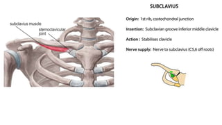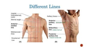 This document outlines key anatomical structures of the chest region, including bony landmarks, lines of orientation, cutaneous innervation, and several muscles such as the pectoralis major and minor. It also describes the pectoral and clavipectoral fascia that connect muscles and cover the chest.