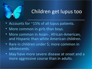 Lupus in children and teens represents about 15% of all lupus cases, primarily affecting girls and minority populations. Symptoms often include unexplained fevers, swollen lymph nodes, skin rashes, and joint pain, while diagnosis relies on clinical criteria similar to adults with potential for partial presentations. Treatment typically involves corticosteroids and other immunosuppressants, with specific challenges in pediatric care including medication side effects and the transition to adult healthcare.