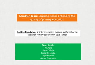 An intensive project is proposed to enhance the quality of primary education in India. Key issues with the current system include irregular attendance, lack of timetables, inadequate facilities, and ineffective teaching methods. The proposed solution would recruit qualified teachers in each district to conduct two-week educational camps for groups of five schools. In the camps, students would be sorted by ability rather than age, and teachers would receive training in improved teaching methodologies. Close supervision of the project is outlined, along with mitigation strategies for potential challenges and an assessment of impact.