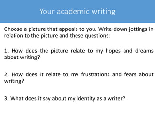 This document summarizes a workshop on publishing pedagogically. It discusses why academics write and publish, including to further their own and others' learning and to contribute to their field. It outlines strategies for improving writing quality, such as writing every day, shutting down inner critics, using concrete examples, and crafting elegant sentences. The document also notes barriers to writing like perfectionism and heavy workloads, and recommends writing groups and mentors to help overcome these barriers.