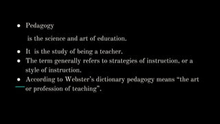 The document discusses pedagogical analysis, which is the systematic breakdown of curriculum content into meaningful components for effective teaching. It outlines objectives and steps involved in pedagogical analysis, such as defining sub-units, writing instructional objectives, selecting teaching strategies, and preparing evaluation criteria. The advantages include promoting learner-centered instruction, systematic content organization, and improved feedback mechanisms for teachers.