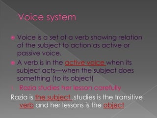 Voice refers to whether a verb is active or passive. In the active voice, the subject performs the action, while in the passive voice the object receives the action. To change a sentence from active to passive voice, the object is moved to the subject position and the main verb is changed to the past participle with a form of "be" as the helping verb, along with retaining the original subject as an optional prepositional phrase introduced by "by".