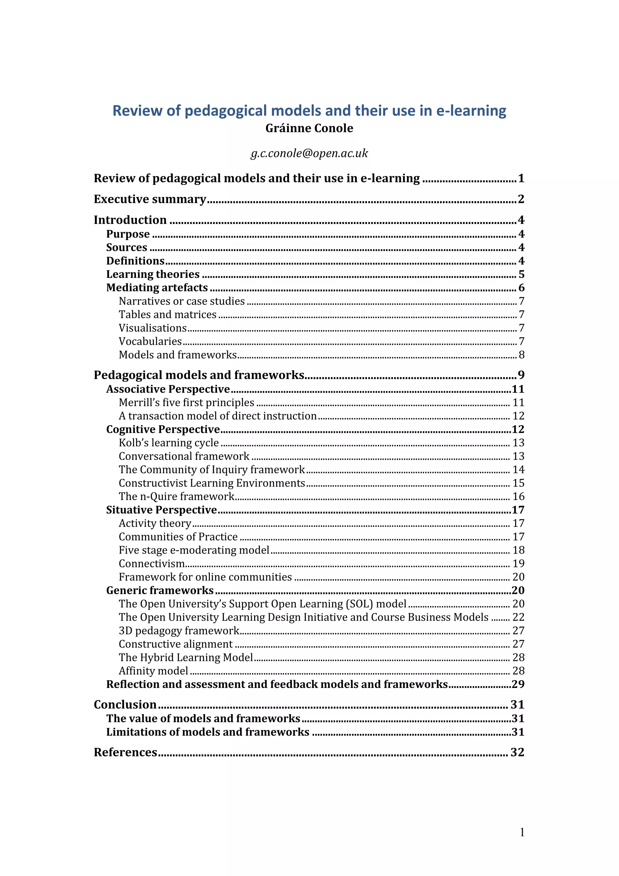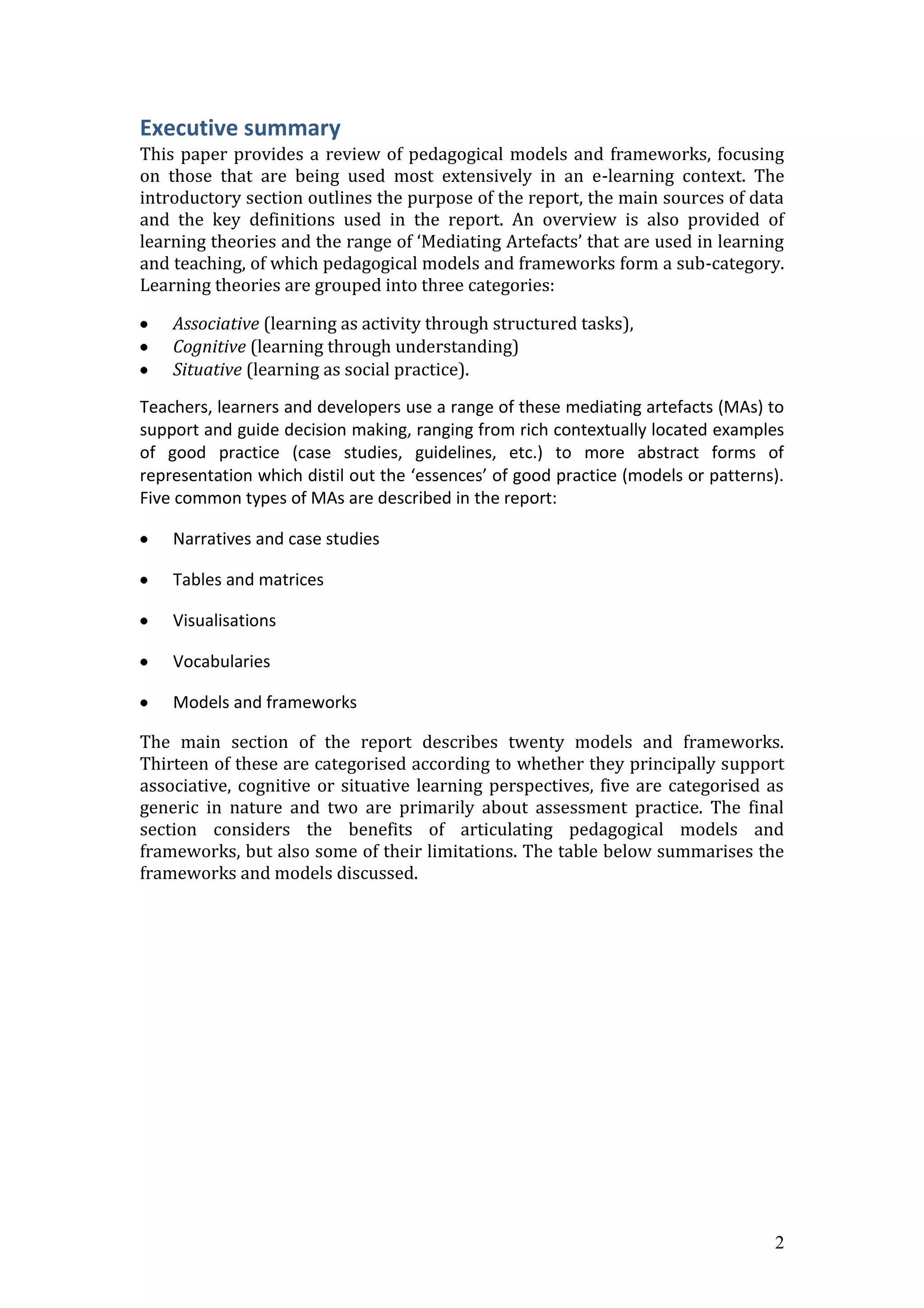 This document provides a review of 20 pedagogical models and frameworks. It introduces the purpose and sources used, and defines key terms like learning theories and mediating artifacts. Learning theories are grouped into associative, cognitive, and situative perspectives. Common mediating artifacts include narratives, tables, visualizations, vocabularies, and models/frameworks. Thirteen models are categorized by learning perspective, five are generic, and two focus on assessment. The models are summarized in a table. In conclusion, the benefits of articulating models include guidance for design/decision making, but there are also limitations to keep in mind.