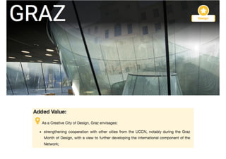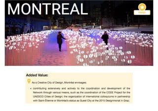 The document discusses the exhibition 'This is Tomorrow,' which explores collaboration among architects, painters, and sculptors, highlighting the challenges in achieving the ideal of symbiotic art and architecture. It outlines various design models (1.0, 2.0, 3.0) that reflect the evolution of design thinking and collaboration methods, stressing the importance of multidisciplinary teams and innovation. Additionally, it introduces the UNESCO Creative Cities Network, aimed at promoting cultural and creative industries for sustainable urban development.