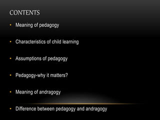 Pedagogy refers to the art and science of teaching children and is based on assumptions about child learners being dependent on the teacher, having limited experience, and viewing learning as acquiring knowledge from the teacher. Pedagogy involves teacher-directed learning and evaluation based on grades. Andragogy refers to adult learning and is based on adults being self-directed, having accumulated experience to draw from, and applying knowledge immediately. Andragogy involves flexible, collaborative learning between teachers and students. The key differences between pedagogy and andragogy are that pedagogy is teacher-centered while andragogy is learner-centered, and pedagogy focuses on content transmission while andragogy focuses on process and personal development.