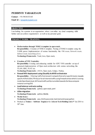 Peddinti Tarakesam is seeking a position utilizing his cloud computing skills, including experience with OpenStack orchestration using TOSCA templates, creating a VNF controller on OpenStack, firewall NFV deployment with Cloudify, load balancing and auto scaling with Python and OpenStack, and L2 gateway migration with Python and MySQL. He has an MCA from JNU and B.Sc in Computer Science, and skills in Python, Java, Linux, networking, and virtualization. His areas of interest include cloud computing, OpenStack, open source software, and object-oriented programming.