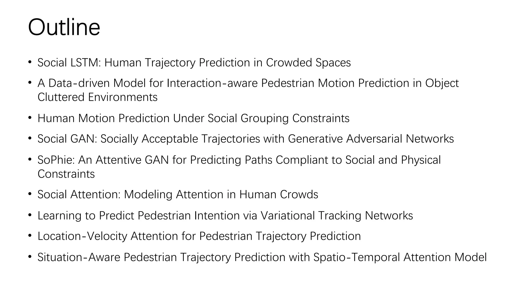 The document discusses several papers related to modeling pedestrian behavior and predicting pedestrian trajectories for autonomous vehicles. It begins with an outline listing the paper titles and authors. It then provides more detailed summaries of three papers: