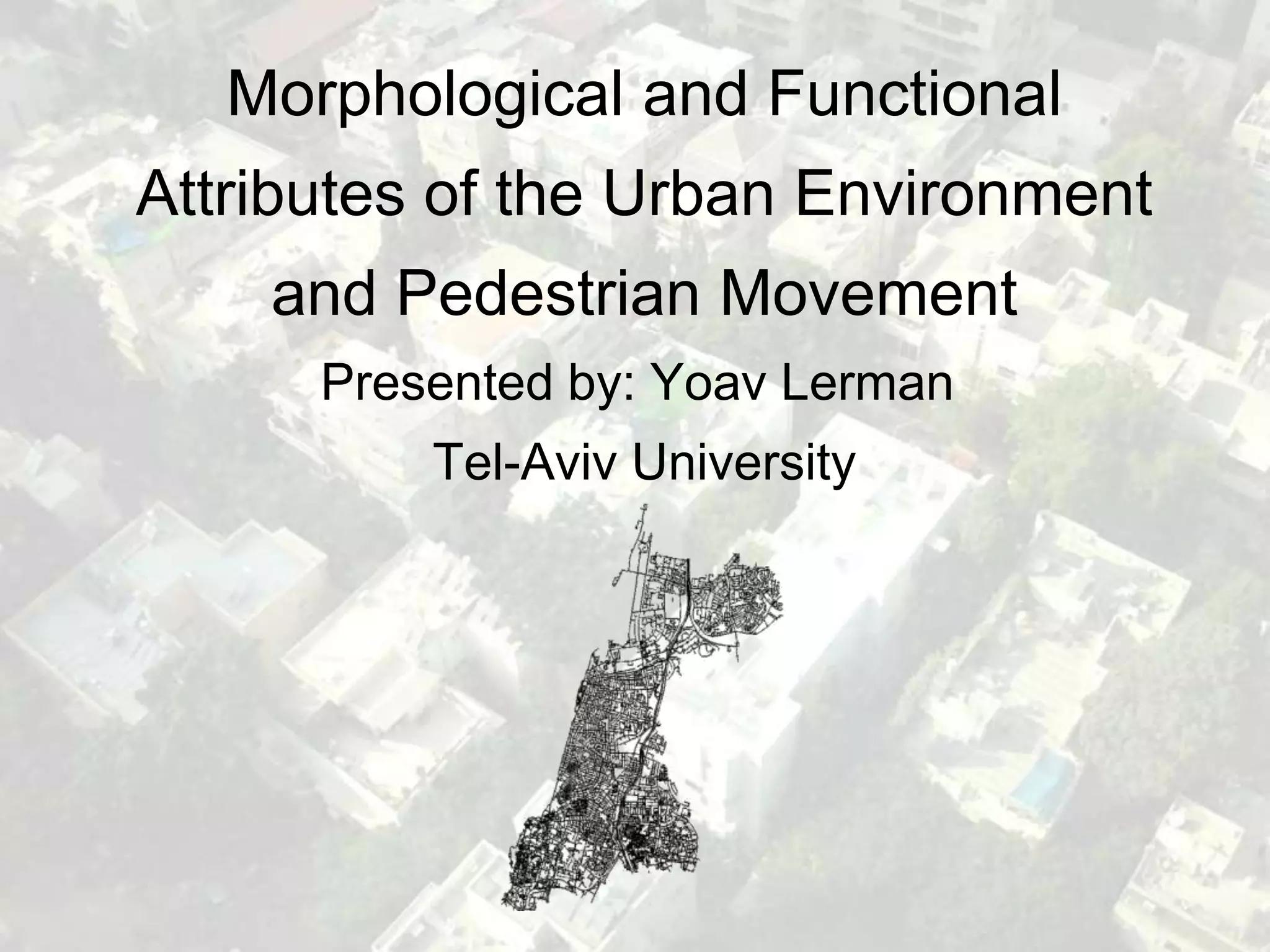 The document presents a study on the relationship between urban environment attributes and pedestrian movement in two areas of Tel Aviv. Key findings indicate that connectivity by street name, total commercial front, and residential density significantly correlate with pedestrian volume, with spatial-physical attributes generally showing greater correlation than functional attributes. Notably, the eastern area displays different correlations compared to the western area, largely influenced by the presence of a large square.