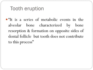 Primary teeth are important for several reasons, including aiding in speech development, chewing and eating, and guiding the eruption of permanent teeth. Tooth eruption is a complex process involving bone resorption and formation, as well as root development over several years before teeth emerge into the mouth. The sequence and timing of primary and permanent tooth eruption follows a generally predictable pattern, though there can be variations in individuals. Factors like genetics and local issues can influence the eruption process and cause problems like delayed, premature, or ectopic eruption.