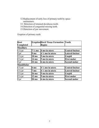This document discusses preventive orthodontics and measures taken to prevent malocclusion in children. It focuses on caries control, periodontal health, and preventing malocclusion. Key aspects include periodic oral examinations of children to detect early problems, preservation of arch length, replacement of lost primary teeth with space maintainers, and intercepting potential irregularities to facilitate future treatment. Conditions that can cause orthodontic problems include crowding, mismatch of tooth and jaw size, breathing issues, and thumb sucking. The general factors influencing malocclusion with premature tooth loss include abnormal oral muscles, oral habits, existing malocclusion, and erupting teeth adjacent to space left by loss.