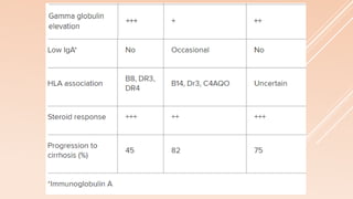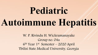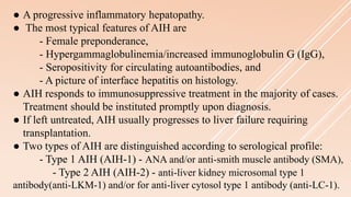 Pediatric autoimmune hepatitis (AIH) is a progressive liver inflammatory disorder predominantly affecting females, typically presenting with hypergammaglobulinemia and autoantibodies. It can lead to liver failure if not treated promptly and can be classified into two main types based on autoantibody profiles. Effective treatment involves immunosuppressive therapies, and patients may require liver transplantation in severe cases.
