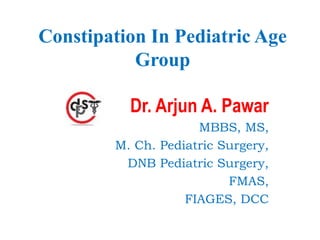 Constipation is a common gastrointestinal issue in children. It can be functional or organic in nature, with functional constipation making up the majority of cases. The document discusses the definition, epidemiology, risk factors, evaluation, and management of pediatric constipation. Evaluation involves history, physical exam, and potential imaging and testing. Management is multi-pronged, focusing on education, dietary changes, behavioral modifications, disimpaction if needed, and long-term maintenance therapy often involving laxatives. Surgery is rarely needed and reserved for severe, refractory cases. Childhood constipation can sometimes predict irritable bowel syndrome in adulthood.