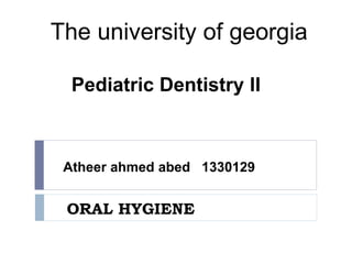 Oral hygiene involves keeping the mouth clean to prevent disease and increase comfort. Proper oral hygiene includes brushing teeth twice daily, flossing daily, eating a balanced diet, and using fluoride products. Brushing should use a gentle back-and-forth motion at a 45 degree angle, while flossing removes food from between teeth. Plaque and bacteria in the mouth can cause cavities if not removed regularly. Maintaining good oral hygiene is important for overall health and was emphasized by the Prophet Muhammad.