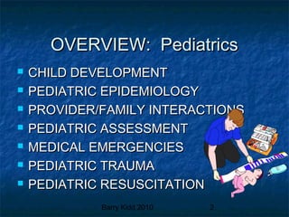 This document provides an overview of pediatric emergencies and assessments. It discusses pediatric development across different age groups and how that impacts examinations. Key points include how trauma is the leading cause of death for children, the importance of involving parents in assessments, and anatomical and physiological differences between children and adults that providers must consider. Proper communication and understanding a child's development level are essential for pediatric assessments.