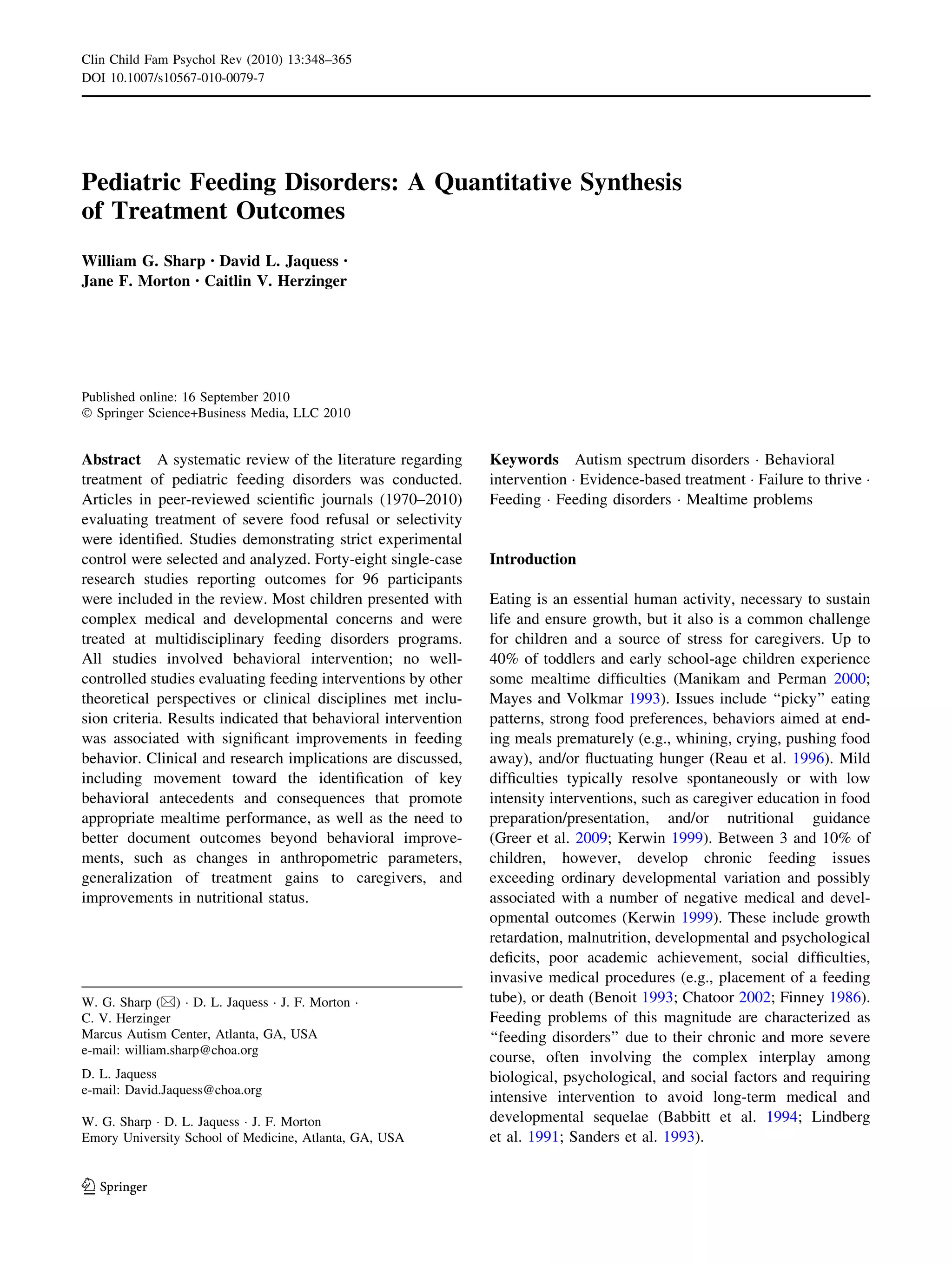 The document summarizes a quantitative review of treatment outcomes for pediatric feeding disorders. 48 single-case research studies involving behavioral interventions for 96 participants were included. Most children had complex medical and developmental issues and were treated at multidisciplinary feeding programs. Results indicated behavioral interventions were associated with significant improvements in feeding behavior. Common effective treatments included differential reinforcement and escape extinction procedures. However, more research is needed to document outcomes beyond behavioral changes and to identify key behavioral factors influencing mealtime performance.