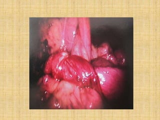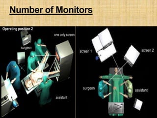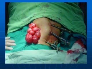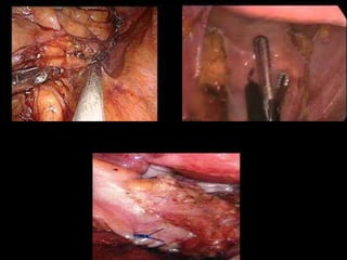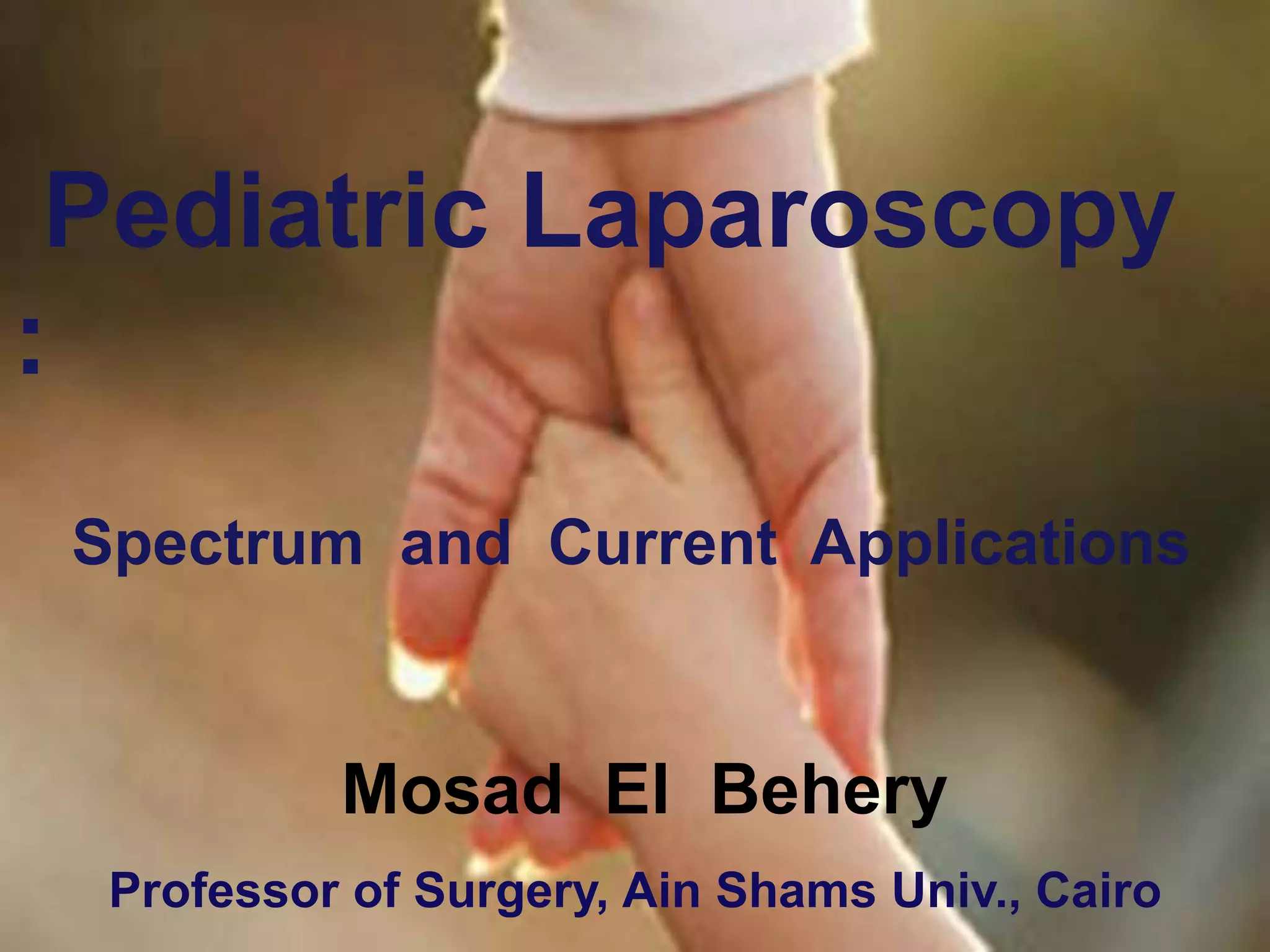 Laparoscopy is becoming more widely used in pediatric surgery due to its advantages over open surgery. It can be used diagnostically and for various procedures such as appendectomy, cholecystectomy, splenectomy, hernia repair, and treatment of undescended testes. Some challenges in pediatric laparoscopy include the thin abdominal wall and limited space. Care must be taken with trocar placement and insufflation pressures. Laparoscopy provides benefits like less pain, shorter hospital stays, and quicker recovery times for children. It is an important technique for pediatric surgeons to learn and incorporate into clinical practice.