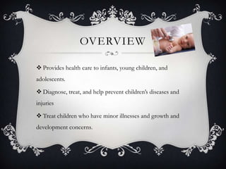 Pediatricians provide healthcare to children from infancy through age 21, diagnosing and treating diseases, injuries, and developmental concerns. They require a bachelor's degree, four years of medical school, and a 3-8 year internship/residency. While starting salaries average around $132,800, experienced pediatricians can earn over $153,000. The job outlook is stable with 22% annual growth potential due to an increasing child population.