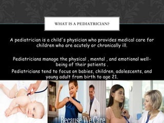 A pediatrician is a doctor who provides medical care for children from birth to age 21. Pediatricians focus on the physical, mental, and emotional well-being of their patients. They manage both acute and chronic illnesses in children. Becoming a pediatrician requires graduating from college, attending medical school, and completing a multi-year residency program specializing in pediatric medicine. Pediatricians work in a variety of settings, including private practices, hospitals, and clinics. They use specialized equipment designed for use with children.