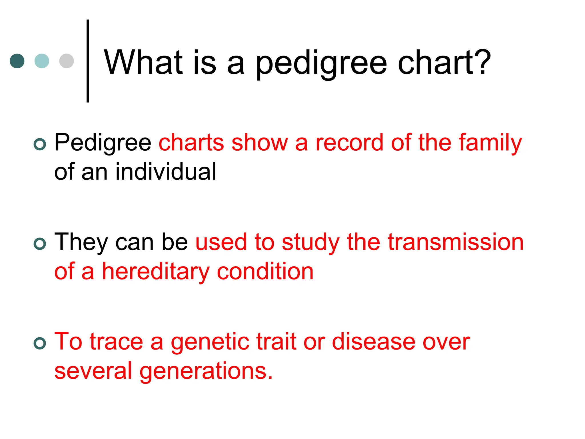 This document provides information about pedigree charts and how they are used to study the transmission of genetic traits and diseases over multiple generations. It defines what a pedigree chart is and explains that they offer an ethical way to study human genetics compared to forcing different types of humans to breed. Pedigree charts use symbols to represent individuals and their characteristics and relationships. They are organized with individuals in each generation numbered from left to right. Pedigree charts can be used to determine if a trait is dominant or recessive and to calculate the probability of offspring inheriting traits when parents with different genotypes are crossed. The document provides examples of homework involving creating a pedigree chart and performing test crosses for traits like earlobes, freckles and hair color in a