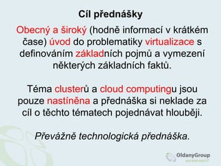 Cíl přednáškyObecný aširoký (hodně informací v krátkém čase) úvod do problematiky virtualizace s definováním základních pojmů a vymezení některých základních faktů.Téma clusterů a cloudcomputingu jsou pouze nastíněna a přednáška si neklade za cíl o těchto tématech pojednávat hlouběji.Převážně technologická přednáška.