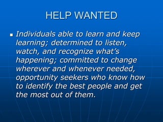 The document discusses the essential elements and characteristics of successful leadership, emphasizing the importance of continuous learning, adaptability, and the ability to inspire and build trust among team members. It outlines various leadership theories and defines leadership as a process of mutual influence aimed at achieving meaningful change. The conclusion underscores that leadership is accessible to everyone, not just a select few.