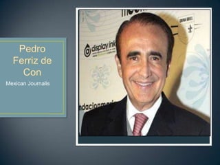 Pedro Ferriz de Con is a Mexican journalist and radio announcer born in 1950 in Mexico City. He studied civil engineering and later earned a master's degree in applied mathematics. Ferriz conducted news broadcasts but was fired for criticizing the Mexican president. He is now a prominent journalist and culture commentator with a radio program on Grupo Imagen. Ferriz is also known for his work presenting the annual telethon to raise funds for children with disabilities.