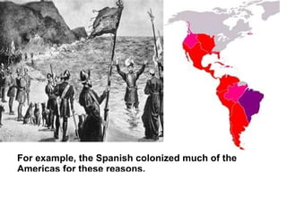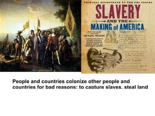 The document discusses the colonization of other people and countries, noting that colonizers like Spain and England did so to capture slaves, steal land, and spread their language and religion. It suggests that as a result of colonization, populations like Latin Americans and early US settlers became mixed with European blood or adopted European culture. The document concludes that ongoing globalization continues this trend of spreading Western influence and threatens to eliminate traditional local cultures.