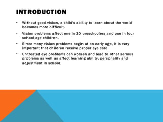 This document provides information about common eye disorders in children. It discusses signs of eye problems, possible eye conditions like amblyopia and strabismus, refractive errors, and ophthalmia neonatorum. Vision problems are common in young children and can affect learning if not addressed. Early diagnosis and treatment of conditions like amblyopia are important to prevent long-term vision loss.