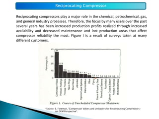 This document discusses materials for compressor valve plates, specifically for reciprocating compressors. It begins by identifying that compressor valves, pressure packing, piston rings and rider bands are the top causes of unscheduled shutdowns for reciprocating compressors. Metallic valve plates were initially used but suffered from issues like impact fatigue, corrosion damage, and inability to handle debris. Plastic materials like polyamide and polyetheretherketone (PEEK) emerged as replacements, with PEEK becoming the most commonly used material due to its high strength, temperature and chemical resistance, and ability to withstand impacts better than metals. PEEK provides more reliable performance for compressor valves.