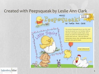 This document provides instructions for making a Peepsqueak book bag with embroidery and quilting. The instructions include cutting fabric and batting pieces, assembling the bag sides by quilting strips of fabric to the batting and lining, adding a pocket and nameplate with embroidery, attaching a zipper, sewing the sides together, and adding handles. Optional instructions are given for making a matching pencil bag with similar construction.