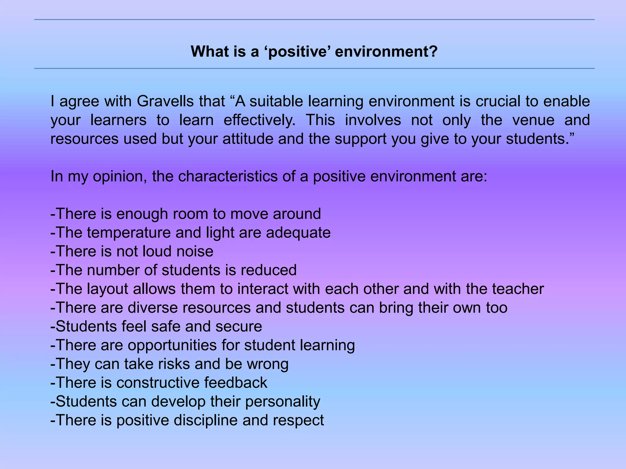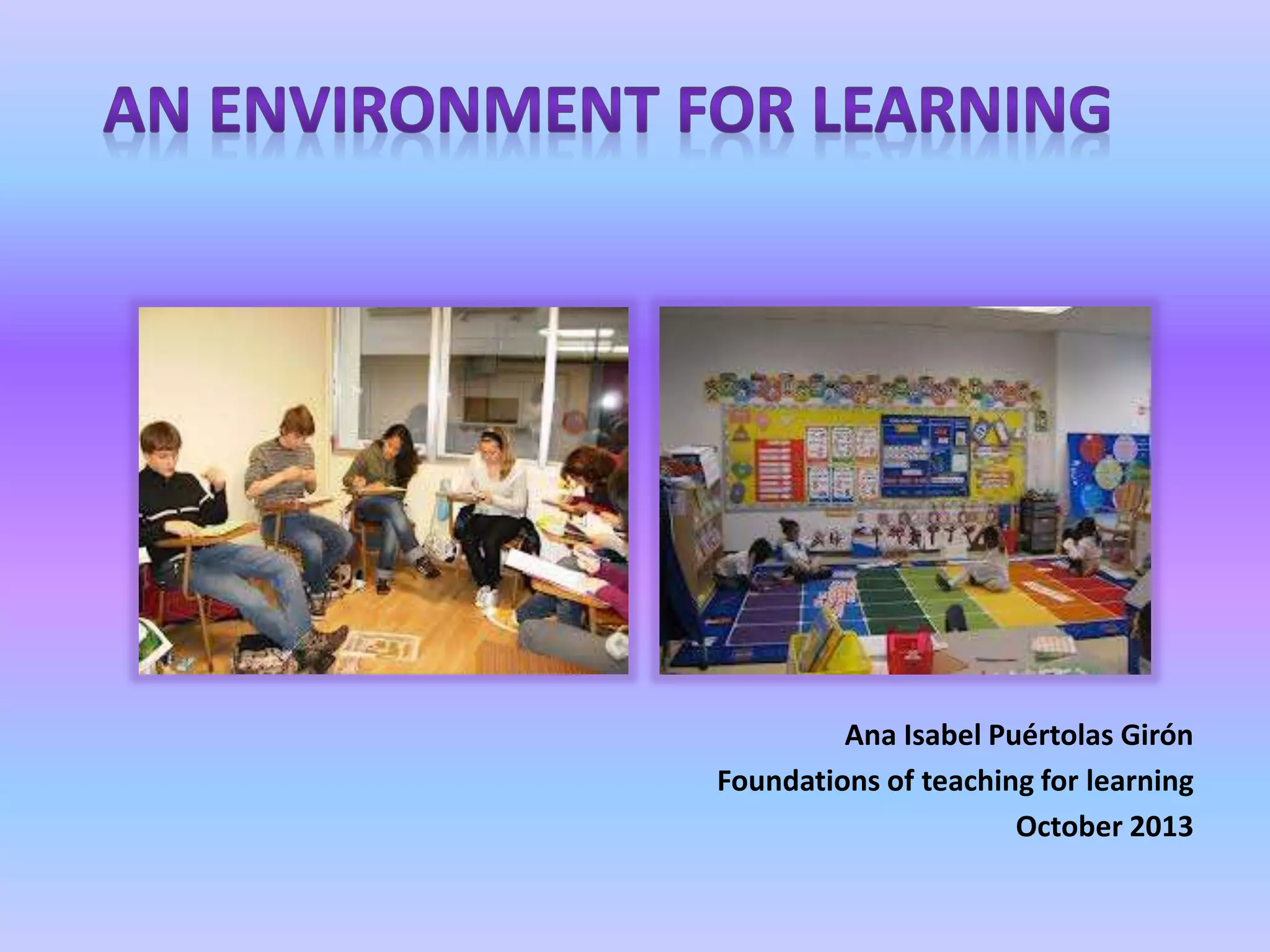 This document contains a summary by Ana Isabel Puértolas Girón of the key factors in creating a positive learning environment. Some important characteristics of a positive environment include adequate space, temperature, light and noise levels, as well as opportunities for student interaction, risk-taking, and feedback. However, the teacher's ability to control the environment is limited by school policies, a lack of resources, and social factors impacting students. While the teacher can arrange furniture and use different resources, true constraints include rigid policies, economic shortages, and unsafe neighborhoods impacting student safety and support. The teacher reflects on strengths like negotiating with students and conveying enthusiasm, as well as weaknesses in discipline, unrealistic goals, and feeling pressure from