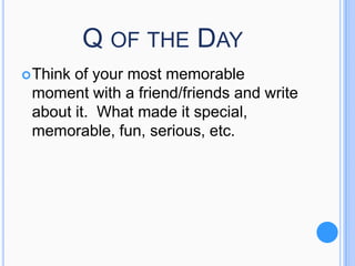 This document provides advice and discussion prompts around peer relationships and dealing with peer pressure. It discusses important qualities to look for in friends, such as trustworthiness and good listening skills. It also addresses different types of peer groups, including popular kids, bullies, and gossipers. The document provides tips for resisting negative peer pressure through assertive communication techniques. It emphasizes remaining true to one's principles rather than chasing popularity or conformity.