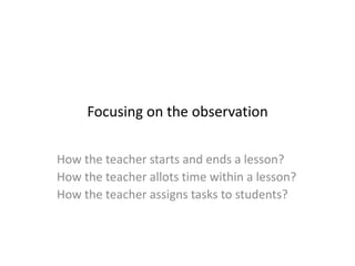 The document outlines topics for a classroom observation, including how the teacher starts and ends lessons, allocates time, assigns tasks, deals with reticent students, organizes groups, and asks questions. It notes specifics like the type and content of questions asked, wait time after questions, how instructions are given, and whether students understand instructions. Other suggested observation topics include student task performance, time on task, the teacher's action zone, textbook use, and pair/group work. The document lists names of observers and closes by thanking the reader for their time.