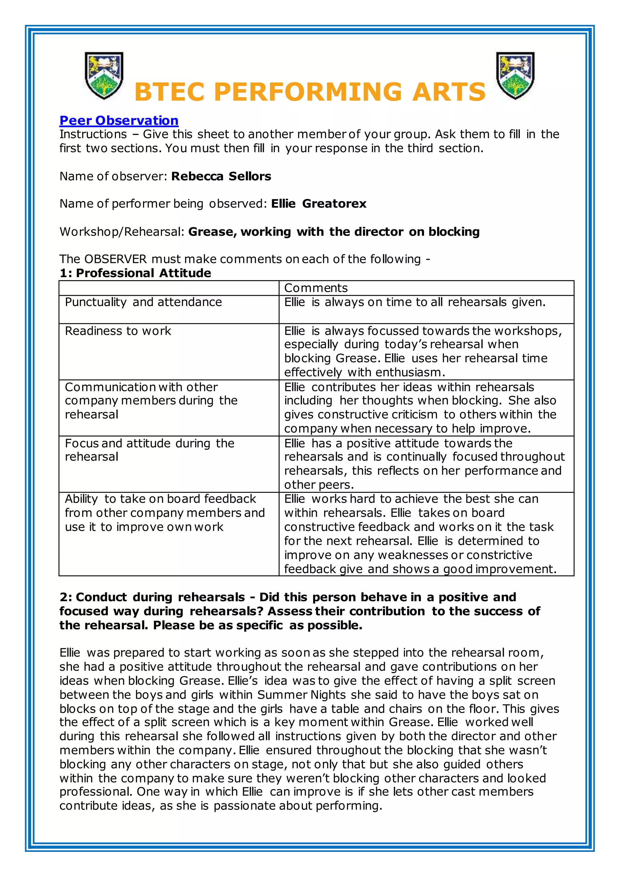 Ellie Greatorex was observed during a rehearsal for Grease where she was working with the director on blocking. According to the observer, Ellie displayed a professional attitude by always being punctual, ready to work, communicating ideas to others, and having a positive focus during rehearsals. The observer noted that Ellie took feedback well and worked to improve. In her response, Ellie acknowledged that while she is passionate, she needs to allow others to contribute more ideas to foster a collaborative team approach.