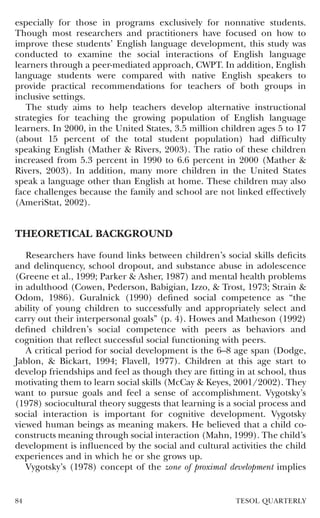 This study examined the effects of classwide peer tutoring (CWPT) on the social interactions of English language learners and native English speakers in two second-grade classrooms. CWPT was implemented to teach math and spelling, with social interactions as the dependent variable. Students' frequency of positive and negative social behaviors during CWPT sessions was observed and analyzed. The study found that CWPT increased positive social interactions for both English language learners and native English speakers, indicating it is an effective instructional strategy to support social development for all students.