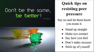 The document explores the concept of peer pressure, emphasizing its historical context, particularly in relation to significant events like the Holocaust and the Rwandan genocide. It discusses how peer pressure affects children and adolescents, highlighting both its negative consequences, such as loss of self-respect and academic issues, and positive influences, like promoting healthy behaviors. Additionally, it addresses the importance of resisting negative peer pressure and outlines various forms of social influence encountered by youth.