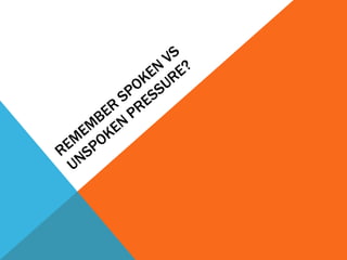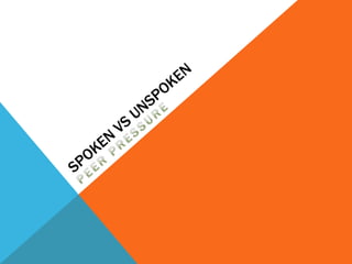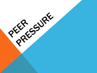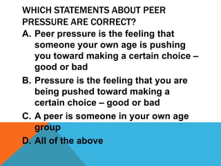 This document discusses peer pressure, including definitions of spoken and unspoken peer pressure. It provides examples of different types of peer pressure like reasoning, put downs, rejection, and unspoken pressure. It also discusses why resisting peer pressure can be difficult and provides strategies for resisting peer pressure assertively, like saying no assertively, standing up for yourself, and removing yourself from risky situations. The document is an educational resource about navigating peer pressure situations.