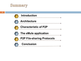 2) In P2P networks like eMule, peers can act as both clients and servers, sharing files through direct exchange and without a centralized authority.